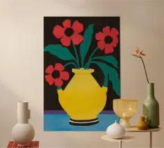 Una gioiosa natura morta di un bouquet di papaveri rossi in un vaso di terracotta, su un allegro sfondo patchwork di piastrelle gialle e blu.