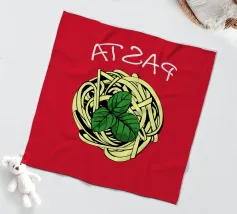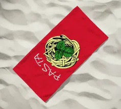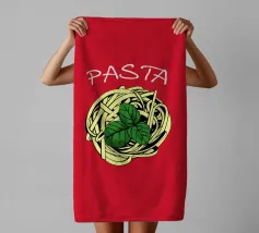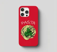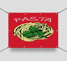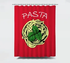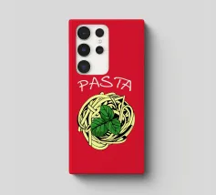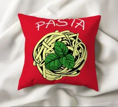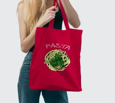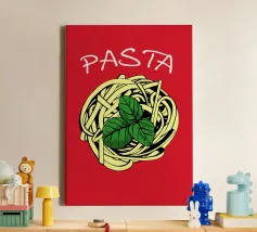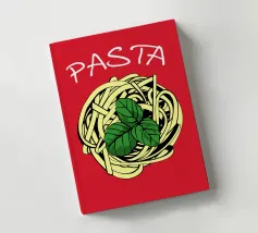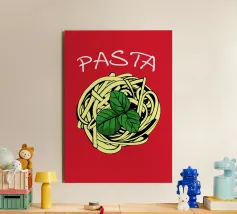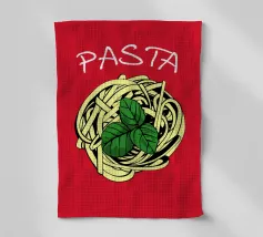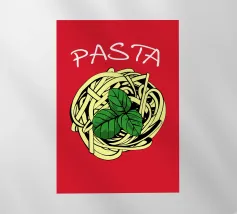Tagliatelle su sfondo rosso con foglie di basilico e scritta Pasta