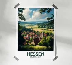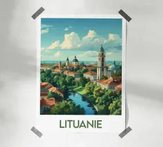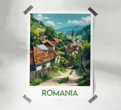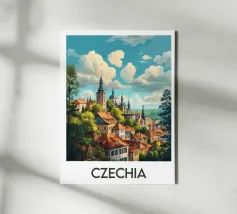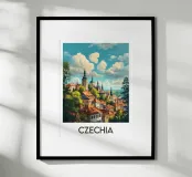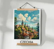 Poster della Repubblica Ceca, un'affascinante illustrazione di uno storico villaggio dai tetti rossi nel cuore della natura. Ideale per una decorazione murale romantica e pittoresca.