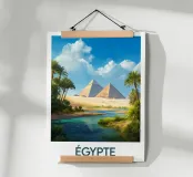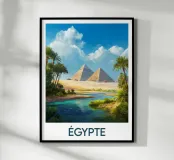 Lasciatevi trasportare da questo poster illuminato che raffigura le maestose piramidi d'Egitto affacciate su un'oasi lussureggiante. Un capolavoro visivo che cattura tutta la magia del deserto e la serenità del Nilo. Ideale per una decorazione murale esotica e stimolante.