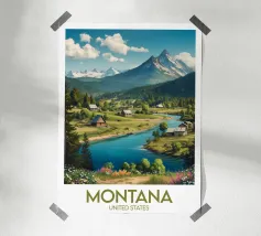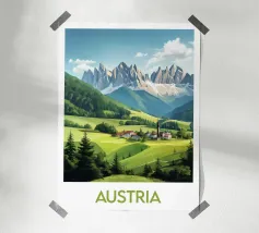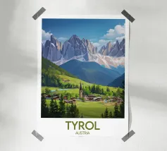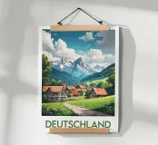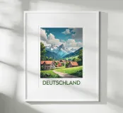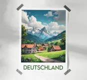 Poster illustrato di un tranquillo villaggio tedesco ai piedi delle Alpi, con chalet tradizionali, una chiesa con campanile a punta e prati fioriti. Una decorazione murale bucolica, ideale per gli amanti della montagna e degli autentici paesaggi europei.