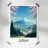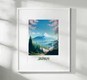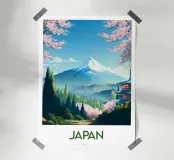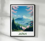 Poster di viaggio che mostra il Monte Fuji circondato da alberi di ciliegio in fiore e da una pagoda tradizionale giapponese. Una scena pacifica emblematica del Giappone, ideale per una decorazione murale zen e naturale.