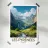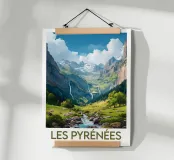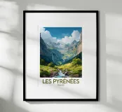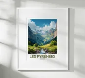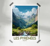 Un'illustrazione dei maestosi Pirenei francesi, con una valle verde e lussureggiante, fiumi limpidi, cascate e pacifiche pecore al pascolo. Un poster decorativo di grande ispirazione che evoca la calma e la bellezza naturale delle montagne.