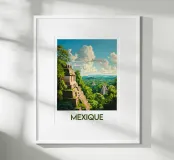 Poster del Messico che illustra le maestose piramidi Maya nel cuore di una giungla lussureggiante. Perfetto per una decorazione murale coinvolgente ispirata ai misteri della civiltà precolombiana.