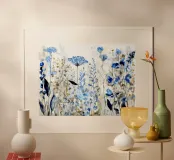 An ethereal tangle of wildflowers in cool indigo and warm ochre hues, this floral composition blends expressive brushwork with botanical detail. Delicate yet bold, the scene captures the untamed rhythm of a summer field in watercolor bloom.
