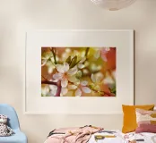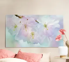 Delicate spring blossoms on a branch bathed in warm light. Soft focus and natural colours emphasise the lightness and freshness of the scene.