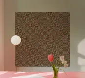 A repetitive geometric pattern features diamond shapes in warm brown and beige tones, interspersed with black and green lines. The design creates a visually intricate grid that is both symmetrical and uniform.