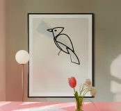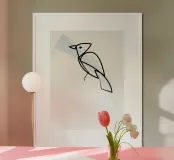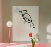 Questo delicato disegno su una sola linea cattura l'essenza stravagante di un uccello crestato in un unico tratto fluido. La linea nera decisa definisce la sua forma giocosa, mentre una pennellata blu traslucida aggiunge una sottile nota di colore, come un fugace scorcio di cielo o un acquerello che sfuma dolcemente sulla carta.