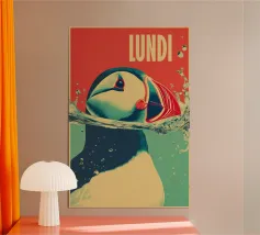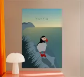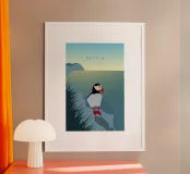 Un design di viaggio minimalista con un simpatico pulcinella di mare o puffin sul paesaggio costiero dell'Islanda.