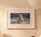 Un allegro pupazzo di neve con cappello e sciarpa rosa sorride tra i fiocchi di neve che cadono in un tranquillo paesaggio invernale. Gli alberi circostanti aggiungono fascino alla stagione.