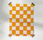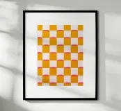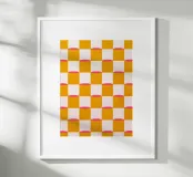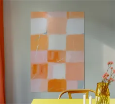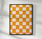 Diese lebendige abstrakte Malerei kombiniert ein schachbrettartiges Muster in Senfgelb, Pink und Weiß mit geometrischen Formen, um eine kreative und moderne Atmosphäre zu schaffen. Die leuchtenden Farben und minimalistischen Elemente machen dieses Kunstwerk zu einem beeindruckenden Statement in jedem Raum.