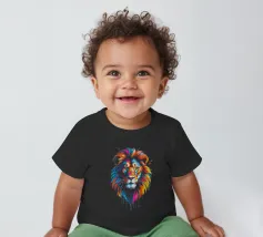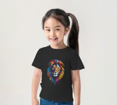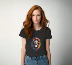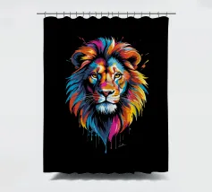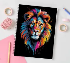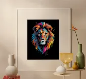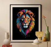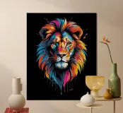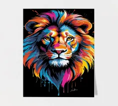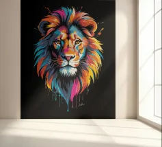 Un dipinto che raffigura una rappresentazione vibrante e colorata di un leone. Varie tonalità di rosso, blu, arancione e giallo sono utilizzate per creare una suggestiva rappresentazione del maestoso animale.