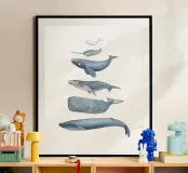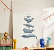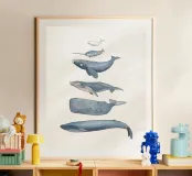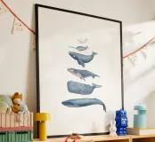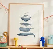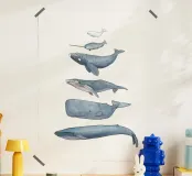 Illustrazioni disegnate a mano di diverse balene con inchiostro e acquerelli.