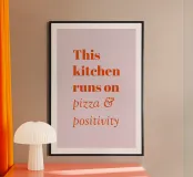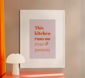 Una dichiarazione per tutti coloro che considerano la cucina non solo un luogo per cucinare, ma anche uno spazio per il divertimento, il piacere e il buon umore. Lo slogan "This kitchen runs on pizza & positivity" (Questa cucina funziona con la pizza e la positività) è inserito in un'elegante combinazione di caratteri serif in grassetto e corsivi giocosi. La scelta del colore - un caldo e appetitoso arancione terracotta su un morbido sfondo lilla - trasmette intimità e un aspetto moderno e invitante. Il design minimalista, privo di illustrazioni aggiuntive, attira l'attenzione sul messaggio, rendendolo un divertente richiamo visivo in qualsiasi cucina.