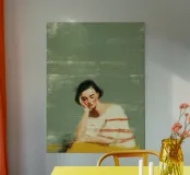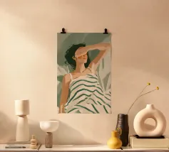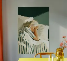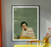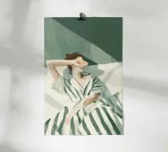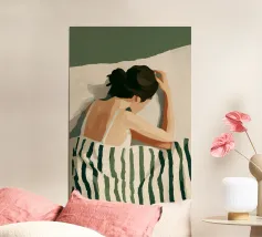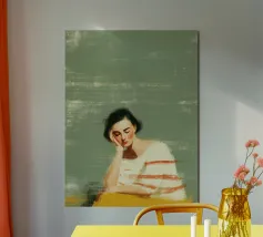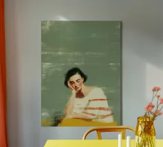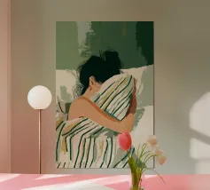Questo ritratto contemporaneo cattura un momento di introspezione e di quiete emotiva. Una figura dai tratti morbidi appoggia la testa sulla mano, emergendo da pennellate stratificate su uno sfondo verde salvia. I toni caldi della pelle e i sottili accenti di ocra e terracotta contrastano delicatamente con l'ambiente freddo, creando equilibrio e profondità. La texture espressiva e pittorica enfatizza lo stato d'animo piuttosto che i dettagli, invitando lo spettatore in uno spazio calmo e contemplativo. L'opera d'arte esplora la solitudine, la tenerezza e la quiete interiore, rendendola adatta a interni moderni, ad ambienti di riflessione o ad ambienti curati.