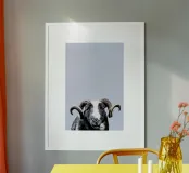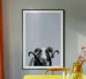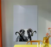 Immergetevi nel fascino rustico di questa splendida fotografia con un maestoso montone. Questa accattivante stampa di animali da fattoria è perfetta per gli amanti degli animali e per chiunque voglia aggiungere un tocco di atmosfera rurale al proprio arredamento.