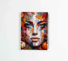 Ritratto in acrilico in cui il volto di una donna emerge da uno sfondo di foglie autunnali, frutti ed elementi naturali. Una ricca tavolozza di colori caldi, arancioni, rossi intensi, gialli dorati e marroni terrosi, che evocano immediatamente l'essenza dell'autunno. Il volto stesso è costruito con macchie di colore strutturate, quasi a mosaico, che fondono stili astratti e realistici.