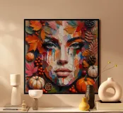 Acrylic portrait painting where the face of a woman emerges from a backdrop of autumn leaves, fruits, and natural elements. A rich palette of warm colours—fiery oranges, deep reds, golden yellows, and earthy browns—that instantly evoke the essence of fall. The face itself is constructed with textured, almost mosaic-like patches of colour, blending abstract and realistic styles.