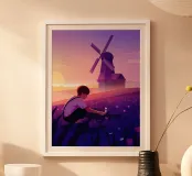 Ragazzo con fiori al mulino a vento di sera Lofi Art poster