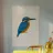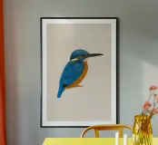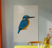 Questa opera d'arte è una vivace illustrazione di un martin pescatore di profilo. Presenta piume blu ceruleo sulla testa, sul dorso e sulle ali, in contrasto con il petto e le parti inferiori color oro-arancio. Il becco nero e la gola bianca aggiungono dettagli sorprendenti. Su un morbido sfondo beige, i colori vivaci del martin pescatore risaltano in modo particolare.