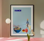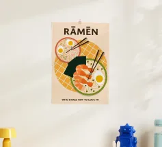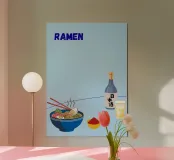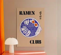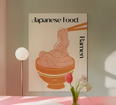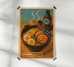 Poster giapponese per Ramen e Sake! Una splendida illustrazione di una ciotola fumante di noodles Ramen accanto a una tradizionale bottiglia di Sake (Nihonshu) e a un bicchiere. Questo disegno è perfetto per aggiungere un tocco moderno e giapponese alla cucina, alla sala da pranzo o al soggiorno. L'audace sfondo blu e l'accattivante immagine del cibo creano un'atmosfera accogliente e appetitosa. Un'opera d'arte da parete ideale per gli amanti del cibo e della cultura giapponese! Ramen, cibo giapponese, sake, Nihonshu, noodles, illustrazione, food art, arredamento cucina, sala da pranzo, blu, moderno, Giappone, accogliente, bacchette, cucina asiatica, bevanda.