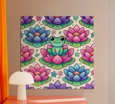 Questa illustrazione mostra gli splendidi dettagli di una serena rana verde in mezzo a un giardino fiorito punteggiato di farfalle colorate.