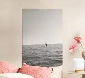Ein ruhiger Moment auf dem offenen Meer – eine Walflosse, die aus dem Wasser ragt, mitten in der Weite des Ozeans. Schlich in Schwarz-Weiß. Ruhe für minimalistische Räume.