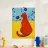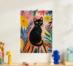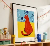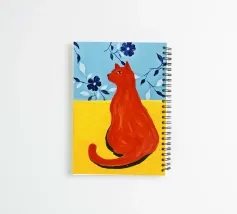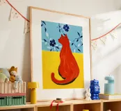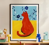 Un dipinto audace e stravagante di un gatto rosso seduto su una superficie gialla vibrante, con un delicato sfondo blu a motivi floreali. Lo sguardo del gatto è misterioso e accattivante e aggiunge un'aria di curiosità e fascino alla composizione.