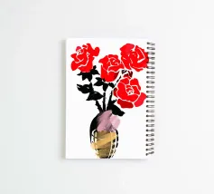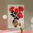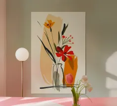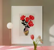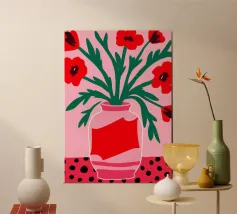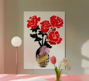 Una vibrante composizione di rose rosse è accentuata da audaci foglie nere, che creano un contrasto sorprendente. I fiori sono inseriti in un vaso strutturato con pennellate astratte nei toni della terra.