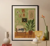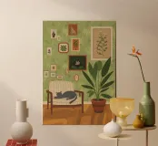 Un angolo accogliente con una sedia, un gatto che dorme e una grande pianta è decorato con immagini incorniciate, creando uno spazio sereno e invitante.