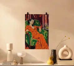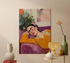Dipinto a olio di una donna in top arancione seduta su un divano verde, con gli occhi chiusi e le braccia distese dietro la testa, stile anni '50, con capelli scuri e frange, pennellate visibili, affascinanti raffigurazioni di personaggi, luci soffuse e un bagliore dorato, con un'estetica retrò.