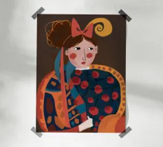 Il dipinto raffigura una persona con capelli corti e scuri acconciati a onde, che indossa un abito con motivi retrò e cerchi e diamanti nei toni del rosa, del marrone e del beige. Lo sfondo è di un semplice colore beige chiaro.