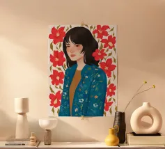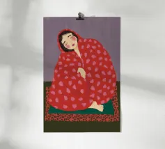 Il dipinto raffigura una persona con capelli corti e scuri acconciati a onde, che indossa un abito con motivi retrò e cerchi e diamanti nei toni del rosa, del marrone e del beige. Lo sfondo è di un semplice colore beige chiaro.