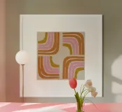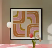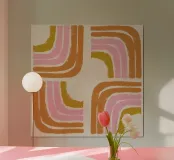 Un disegno audace e giocoso di archi di arcobaleno retrò nei caldi toni di metà secolo del rosa, del senape e dell'ambra. Questo motivo astratto fonde curve vintage con un tocco grafico moderno, perfetto per aggiungere movimento e colore agli interni contemporanei.