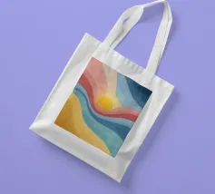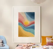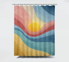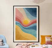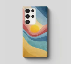 A vibrant abstract landscape inspired by retro color palettes and modern gouache textures. Flowing bands of warm yellows, coral reds, cool blues, and deep navy surround a glowing sun, creating a dynamic and uplifting visual effect. The textured, painterly finish adds depth and character, making this artwork perfect for wall décor, posters, prints, stationery, and contemporary interior design. The harmonious blend of colors evokes warmth, movement, and a nostalgic yet modern aesthetic.