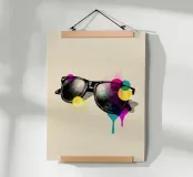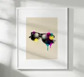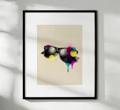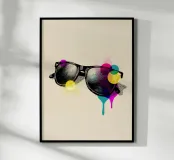 Un disegno in stile vintage di occhiali da sole arricchito da macchie di colore vivaci e gocciolanti. Un pezzo audace e stravagante per gli amanti della moda retrò e dell'arte pop.