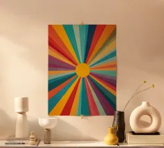 Un motivo radioso e simmetrico con un centro giallo solare da cui partono raggi curvi e ondulati in tonalità calde e fredde: Giallo, pesca, arancio, turchese, azzurro e blu. La disposizione armoniosa e il morbido gradiente di colore creano movimento ed equilibrio allo stesso tempo, come un gioco visivo di luce ed energia.