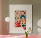 Questa composizione astratta è una danza giocosa di forme organiche e geometriche, chiaramente ispirata ai ritagli di Maraoui. La disposizione ritmica delle forme in una tavolozza di arancione, blu, rosa e beige crea un senso di movimento gioioso e armonioso.