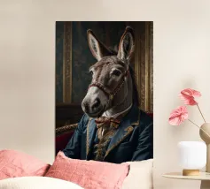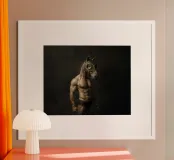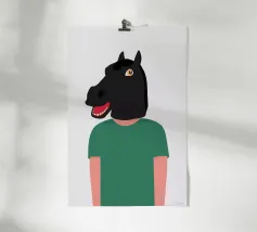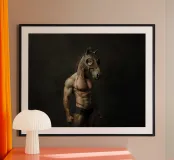Un ritratto surreale con un uomo muscoloso che indossa una dettagliata maschera da cavallo, in posa su uno sfondo scuro e lunatico. La combinazione di tratti umani e animali crea un concetto visivo stimolante e fantasioso.