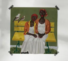 Questa opera d'arte mostra una persona seduta su una sedia a righe, circondata da girasoli e da una borsa verde. Lo sfondo è di un marrone tenue che crea un'atmosfera rustica e riflessiva.