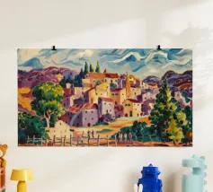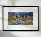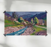 Un sereno dipinto di paesaggio raffigura un limpido ruscello che scorre in una valle, con un ponte di legno che lo attraversa e che conduce a case immerse tra alberi e dolci colline sotto un cielo morbido, trasmettendo un senso di pacifica bellezza naturale.