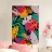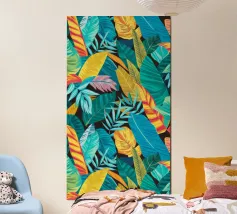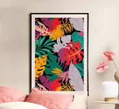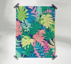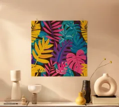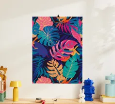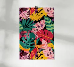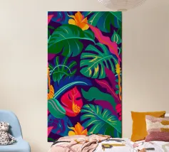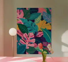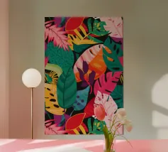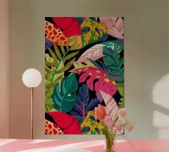 Un motivo coloratissimo di fiori e foglie tropicali in rosa, rosso, arancione e verde acqua, che crea una festa visiva gioiosa ed energica.