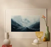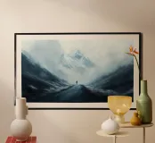 Un viaggiatore solitario cammina lungo una strada di montagna buia e nebbiosa, circondata da imponenti cime innevate. Una fitta nebbia avvolge la scena, creando un'atmosfera misteriosa e drammatica. Il paesaggio freddo e desolato accresce il senso di solitudine e avventura.