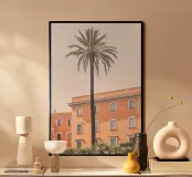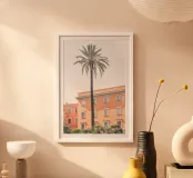 Immergetevi nel cuore di un'estate romana con questa scena di paesaggio urbano minimalista in cui una maestosa palma si staglia su una facciata dai toni pastello dell'arancione. Le linee geometriche e l'autenticità dell'architettura evocano la luce delicata tipica delle giornate mediterranee, catturando sottilmente lo spirito spensierato e caldo della dolce vita italiana. È un invito a godersi il sole, l'estetica pastello e il fascino semplice di una giornata estiva nelle calde strade della capitale italiana.