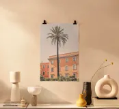 Roma, Italia I Una palma davanti a un'architettura arancione pastello poster con telaio in legno