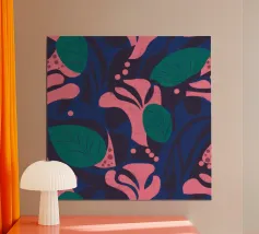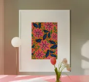 Un fitto disegno di fiori stilizzati in rosa caldo e blu scuro con centri arancioni su uno sfondo scuro. Lo stile è audace, vibrante e grafico.