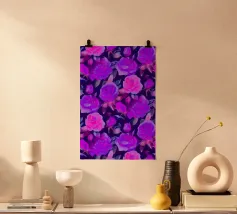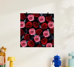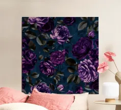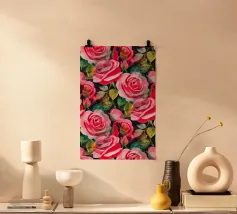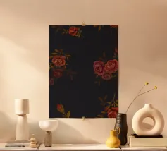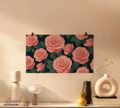 Un accattivante motivo floreale con delicate rose rosa e rigogliose foglie verdi su uno sfondo blu navy. Perfetto per aggiungere un tocco di eleganza e romanticismo a qualsiasi spazio.