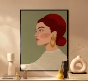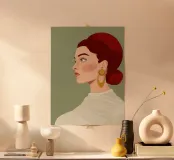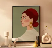 Questo elegantissimo ritratto di profilo mostra una donna con ricchi capelli rosso rubino meticolosamente acconciati in uno chignon. Il suo sguardo riflessivo e sereno, abbinato a un semplice orecchino d'oro su un morbido sfondo verde, crea un'aura senza tempo di classica bellezza e raffinatezza.