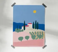 Colori vivaci dividono lo scenario in forme stilizzate che raffigurano un paesaggio collinare attraversato da un fiume blu. Una casa è adagiata all'ombra di una grande collina, con il sole brillante sospeso nel cielo.