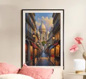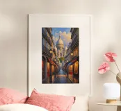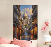 La radiosa Basilica del Sacro Cuore è il fulcro di questa idilliaca scena parigina, incorniciata da architetture classiche e vetrine luminose. La strada acciottolata riflette la luce dorata del sole al tramonto, mentre i lampioni d'epoca aggiungono un tocco nostalgico. Questa incantevole veduta di Montmartre offre un mix perfetto di storia culturale e ispirazione artistica, ideale per chi cerca la vera essenza di Parigi al tramonto.